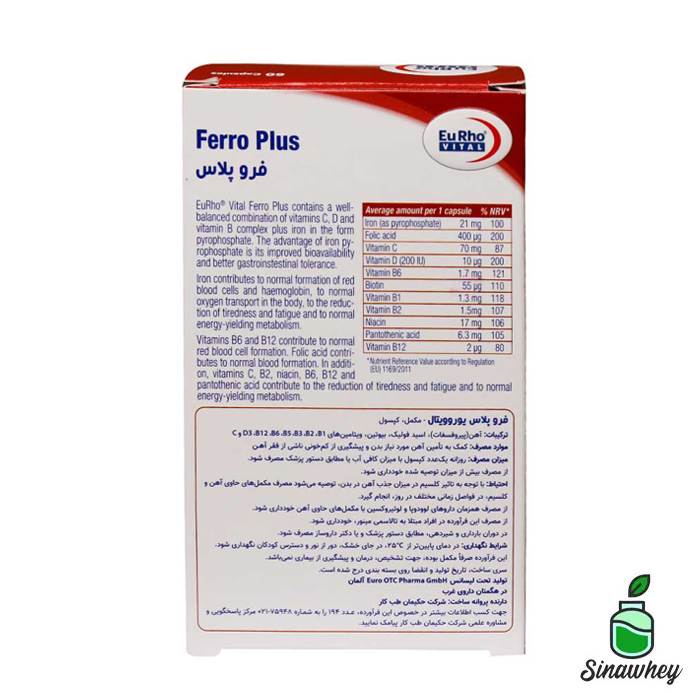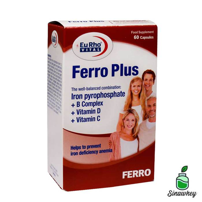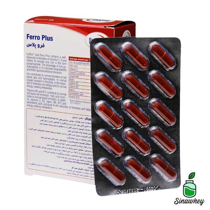 فرو پلاس یوروویتال حاوی ترکیبی متعادل از ویتامین های D3، C و ویتامین های گروه B به علاوه آهن به شکل پیروفسفات می باشد.