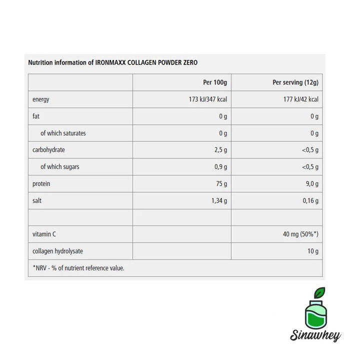 کلاژن آیرون مکس یک مکمل تغذیهای حاوی 10 گرم کلاژن هیدرولیز شده با منشأ گاوی و 40 میلیگرم ویتامین C به ازای هر 12 گرم پودر است که به حفظ سلامت استخوانها و تاندونها، سلامت پوست و مو و کلاژنسازی در بدن کمک میکند.