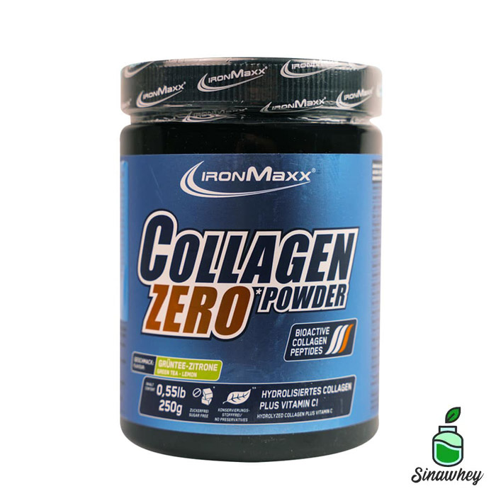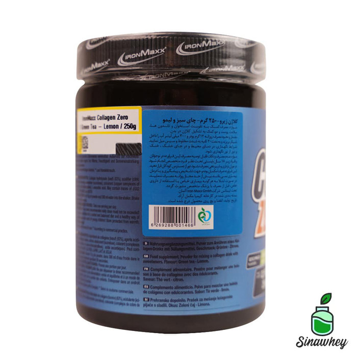 کلاژن آیرون مکس بهشکل پودر با طعم چای سبز و لیمو در قوطی پلاستیکی 250 گرمی تحت لیسانس شرکت Iron Maxx Gmbh آلمان تولید شده و در کارخانه کیمیا مکمل آراد بستهبندی میشود. کلاژن زیرو آیرون مکس فاقد شکر و هرگونه نگهدارنده است.