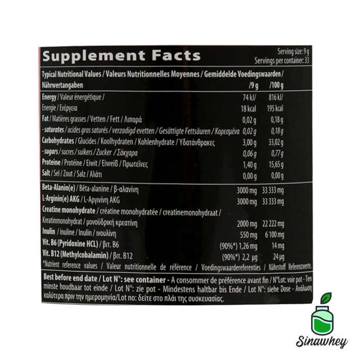 • پری ورک اوت، پودر محتوی کربوهیدرات، بتا آلانین، ال آرژنین، کراتین مونوهیدرات، اینولین، ویتامین B6 و ویتامین B12