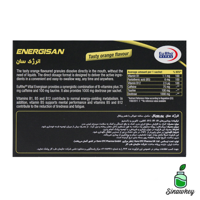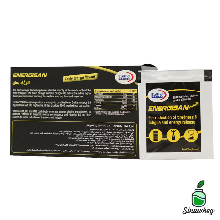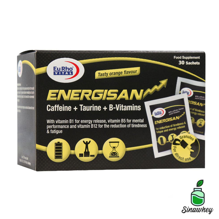 ساشه خوراکی انرژیسان یوروویتال حاوی ویتامینهای B1 ،B5 و B12، کافئین، آمینو اسید تائورین و دکستروز است که باعث افزایش سطح انرژی و بهبود عملکرد ورزشی میشود. همچنین مصرف این مکمل خستگی ذهنی را کاهش میدهد و باعث افزایش قدرت تمرکز در همه افرادی میشود که کارهای فکری و ذهنی انجام میدهند.