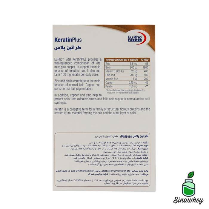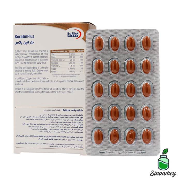 کراتین پلاس یوروویتال ترکیبی متعادل از ویتامین ها به علاوه مس می باشد که در حفظ سلامت و زیبایی مو موثر است. همچنین این فراورده حاوی 150 میلی گرم کراتین در دوز مصرفی روزانه می باشد.