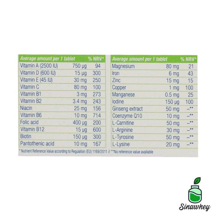 ترکیبات: ویتامین های B12 ،B6 ،B5 ،B3 ،B2 ،B1 ،C ،E ،D ،A، فولیک اسید، بیوتین، منیزیم، آهن، روی، مس، منگنز، ید، عصاره گیاه جینسینگ، کوآنزیم کیوتن، ال کارنیتین، ال آرژینین، ال تیروزین و ال لایزین